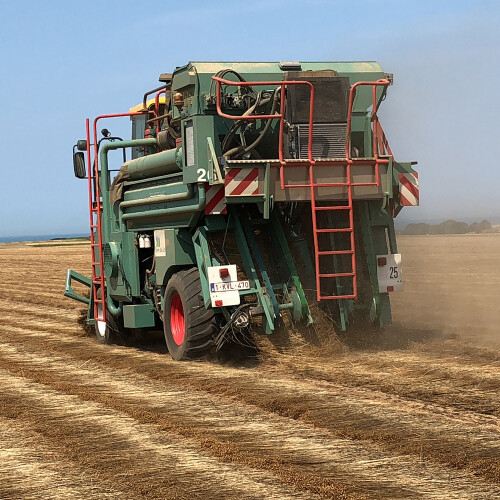 Dies ist eine Maschine, die in einem Arbeitsgang das geraufte und getrocknete Faserleinstroh wendet und gleichzeit die Kapseln abtrennt und Samen ausdrischt – ein Wunderwerk der Technik mit großer Flächenleistung (etwa 2,5 Hektar die Sunde) und super Saatgutqualität (99% Reinheit der Samen)