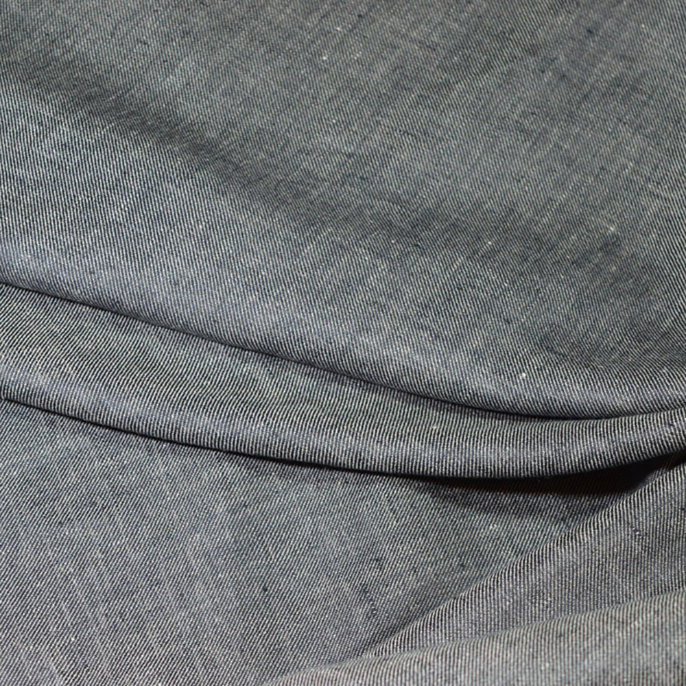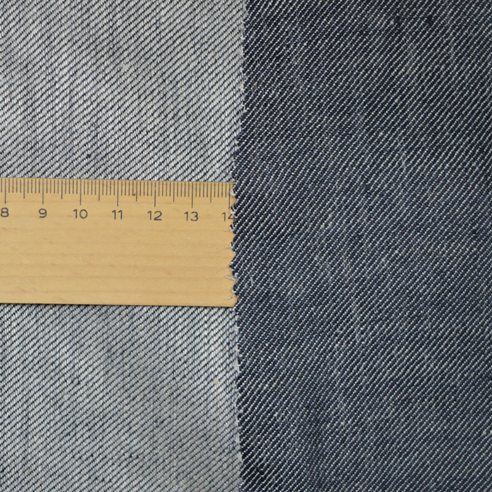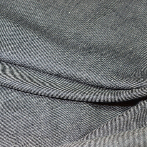 Zweifarbiges Bio-Leinengewebe in Köperbindung mit dem wunderbaren Glanz von Naturleinen. Der Stoff hat naturbelassene Kettfäden und blauschwarz gefärbte Schussfäden, ist wie ein Jeansstoff (Denim) gewebt und weist folglich zwei unterschiedlich gefärbte Seiten auf. Der Fall ist weicher als bei einem Jeansgewebe, der Stoff kann deshalb auch viel leichter drapiert werden.