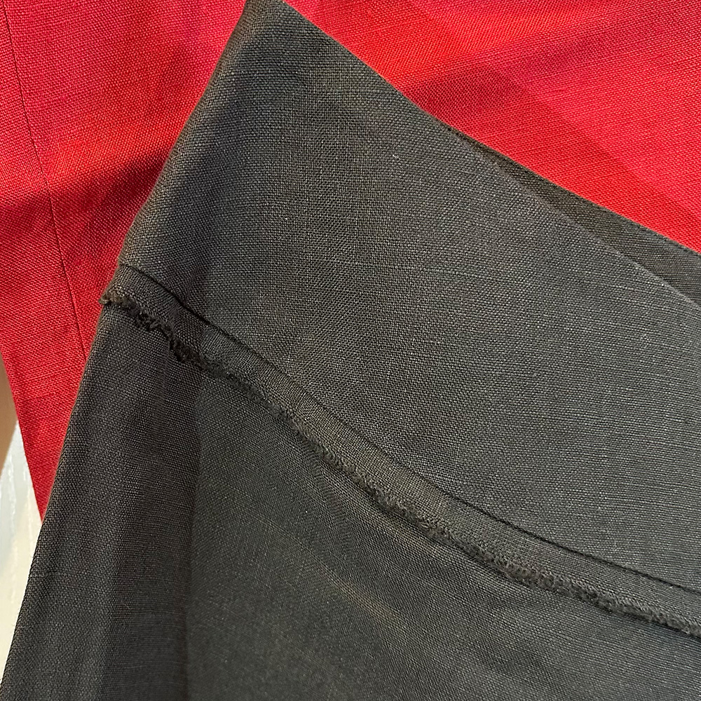 Hose Leinen kbA leinwandbindig d’rot kleine Tasche rückseitig RV links Ziernähte unteres Beindrittel (89 €)