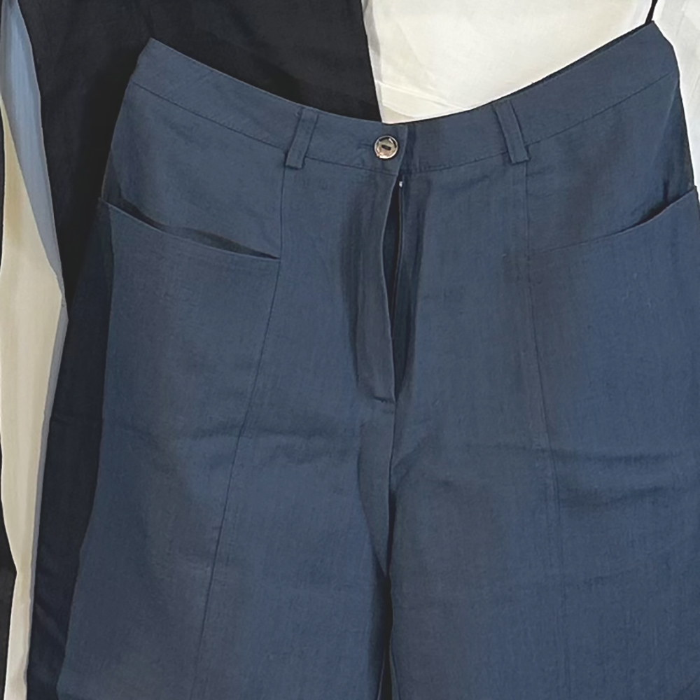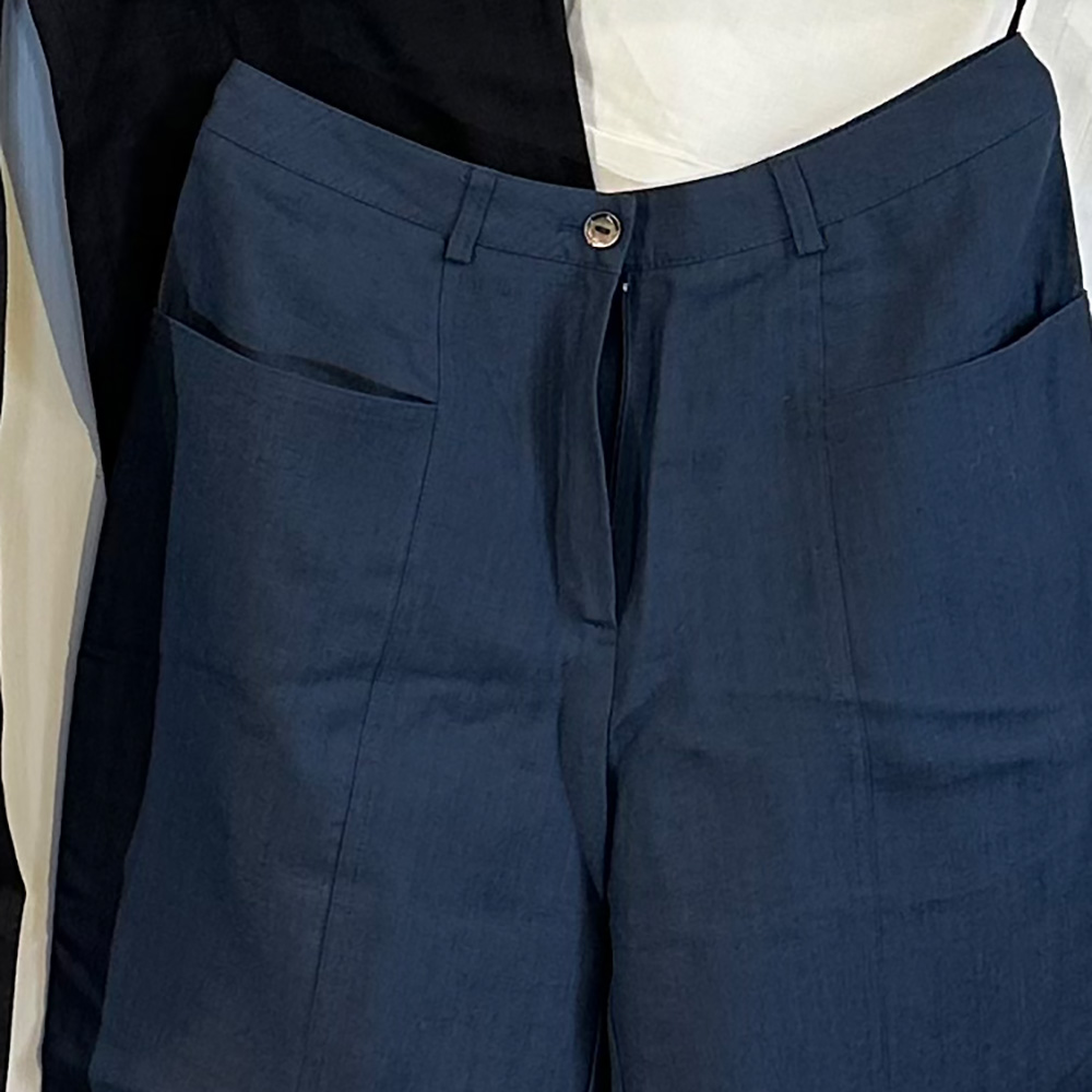 Hose Leinen kbA indigo zwei aufgesetzte Taschen RV und Perlmuttknopf vorn (89€)
