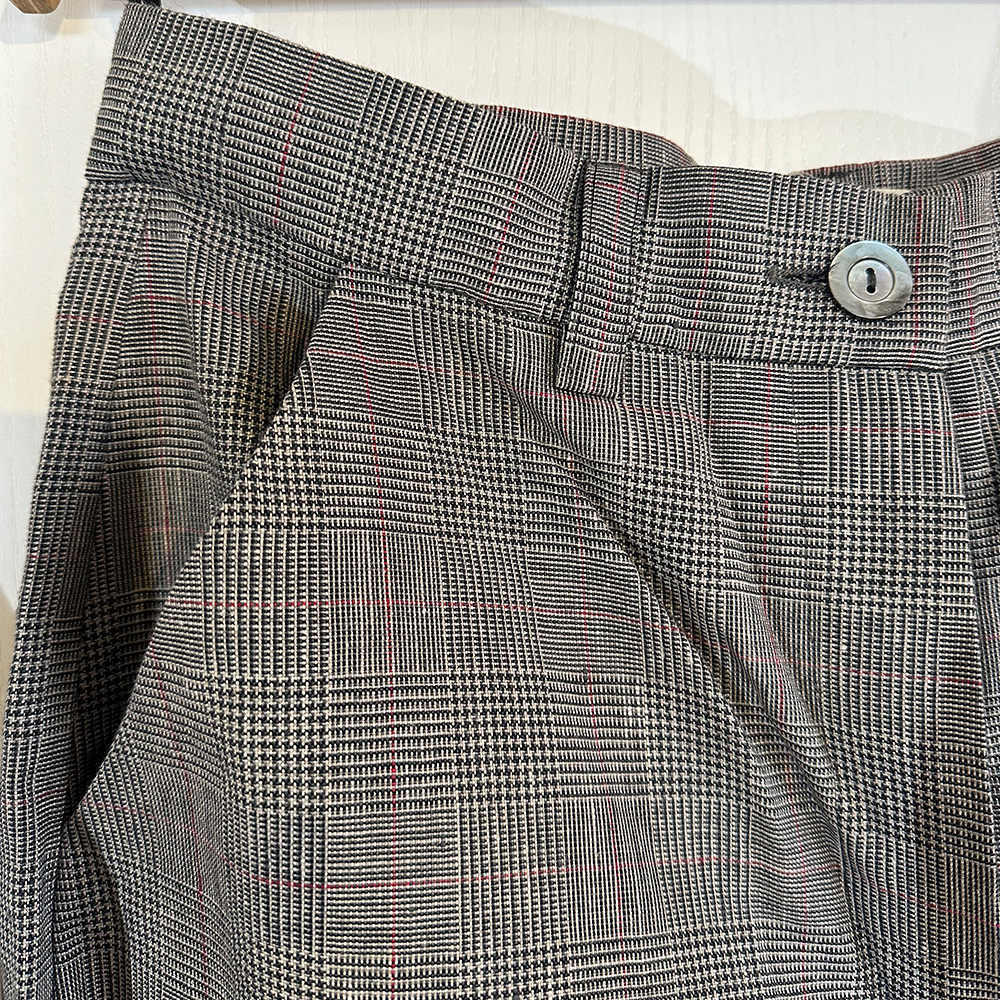 Hose Glencheck Wolle/Leinen fein, passend zur Kurzjacke, Taschen vorn schräg eingesetzt, Futter Seide, RV und Knopf Perlmutt vorn (89€)