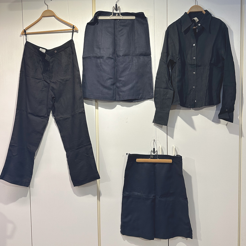 Die Teile haben wir nach dem Fotographieren (wir entschuldigen uns für die geringe Qualität der Bilder, mehr war unter den aktuell eingeschränkten Möglichkeiten nicht zu leisten) versandfertig verpackt; insoweit bitten wir um Ihr Verständnis, dass jedes “Angebotspaket” fix ist. Viele Modelle gibt es auch nicht mehr in kompletten Größensätzen, es macht daher keinen Sinn für uns, einzelne Teile zu fotographieren und separat anzubieten. (Röcke: dunkles Marine, Bluse und Hose: schwarz